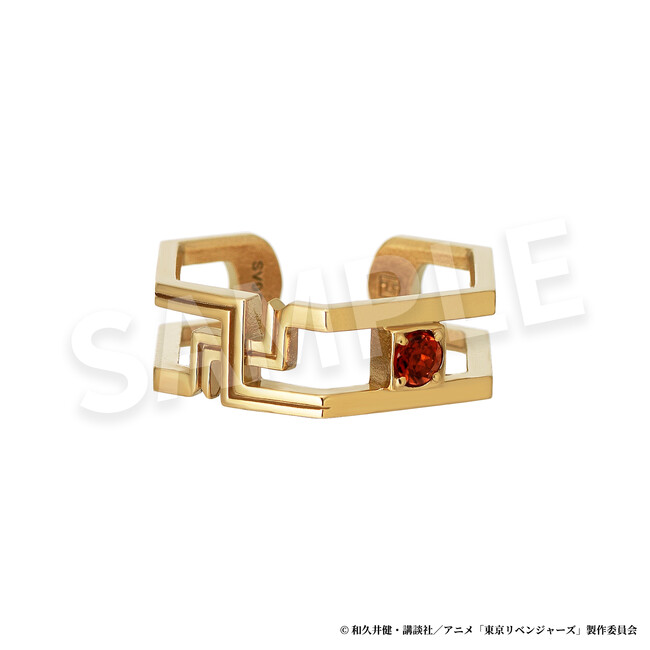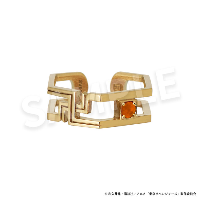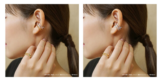 二面性のあるデザインと六角形のフォルムで、過去と未来が交差するTVアニメ『東京リベンジャーズ』の世界観を表現したスタイリッシュなイヤーカフです。着け方を変えることで「東卍のチームロゴをイメージした地金」と「キャラクターをイメージした天然石」の2つのデザインを楽しめる2way仕様で、さらにリング(3号相当)としても使用できる意外な二面性も。天然石はキャラクターのイメージカラーだけでなく石言葉との親和性にもこだわって厳選。ピアスホールがなくても簡単に着けられ、シンプルで幅広くコーディネートできるアイテムです。
