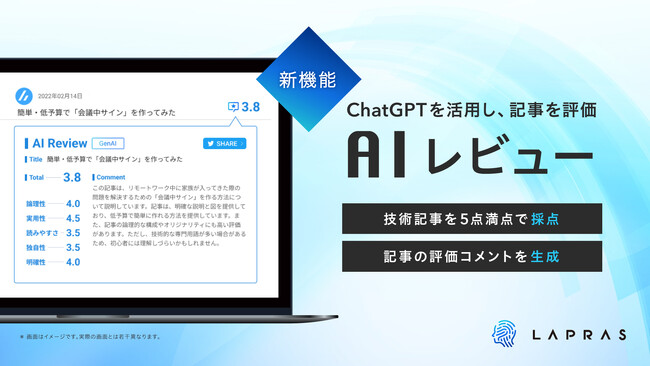LAPRAS株式会社(所在地:東京都品川区、代表取締役:染谷 健太郎 以下、LAPRAS)は、ITエンジニア向けキャリアマッチングサービス「LAPRAS」の新機能として、ChatGPTを活用して記事を評価する「AIレビュー」を6月28日より提供開始(*1)します。