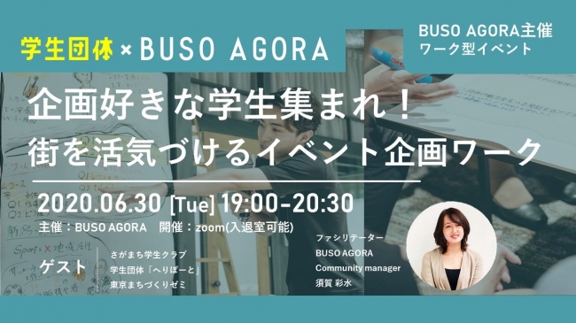 BUSO AGORAが、6月30日19時〜学生3団体(さがまち学生クラブ、学生団体へりぽーと、東京まちづくりゼミ)とコラボ企画「企画好きな学生集まれ!街を活気づけるイベント企画ワーク」を開催。