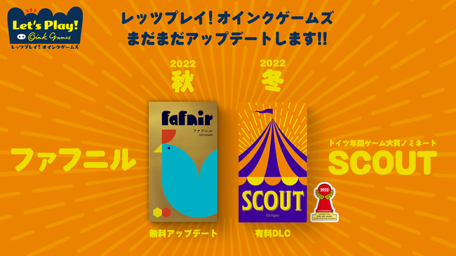 オインクゲームズは2022年7月27日、Nintendo SwitchとSteam用ソフト「レッツプレイ!オインクゲームズ」内で遊べるボードゲームに、今年中に2作品を追加することを発表しました。2022年秋には「ファフニル」を無料で追加予定。さらに2022年冬には、ドイツ年間ゲーム大賞ノミネート作である「SCOUT」が有料追加コンテンツとして追加される予定です。