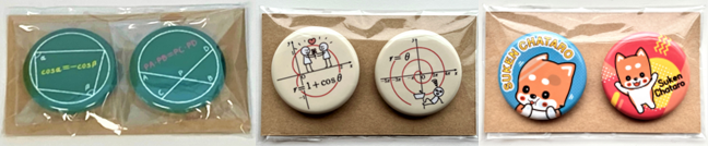 「円の定理」「たのしい数学」「チャ太郎」の3種を発売します。服やカバンにつけて楽しめます。