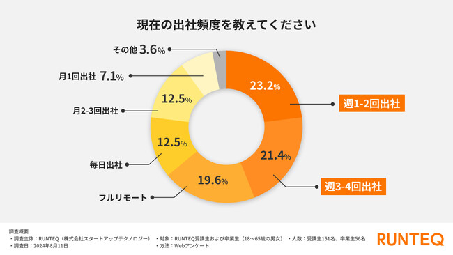 出社頻度では、「週1〜2日出社」(23.2%)と「週3〜4回出社」(21.4%)が全体の44.6%を占めており、リモートワークと出社を組み合わせたハイブリッド型の働き方が主流となっています。