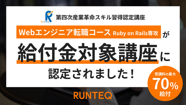 RUNTEQの『Webエンジニア転職コース Ruby on Rails専攻』が専門実践教育訓練給付制度の対象講座に認定されました。
