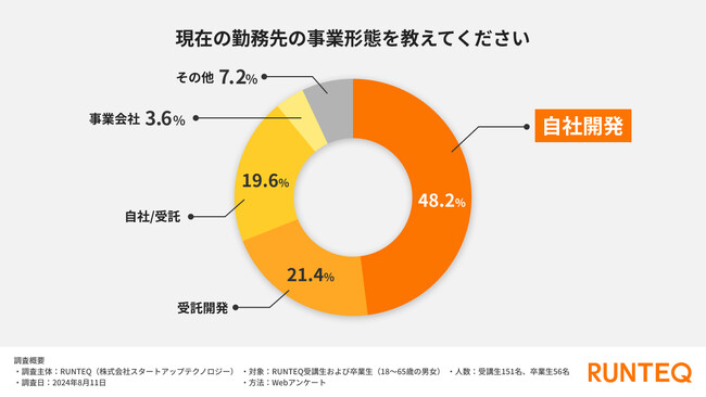 RUNTEQ卒業生の勤務先として最も多いのは「自社開発」(48.2%)で、続いて「受託開発」(21.4%)、「受託/自社開発」(19.6%)が挙げられます。