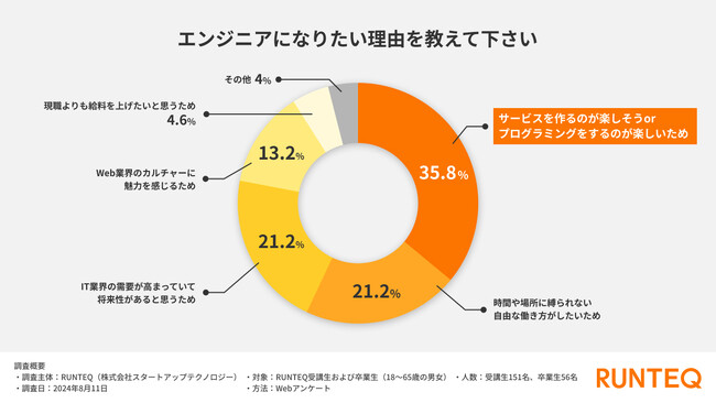 エンジニアを志望する理由として最も多かったのは、「サービスを作るのが楽しそうまたはプログラミングをするのが楽しいため」という回答で、全体の35.8%を占めました。この結果から、多くの受講生がエンジニア職に対して強い興味ややりがいを感じていることがわかります。