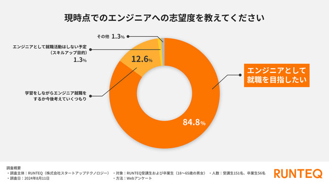 エンジニアへの志望度に関しては、受講生の84.8%が入学時から「エンジニアとして就職を目指している」と回答しており、キャリアチェンジを目的にプログラミング学習を始める人が大多数であることが明らかになりました。