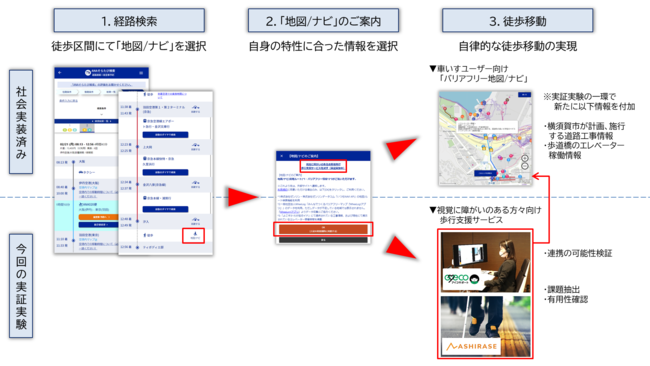 今回の実証実験では、「ANAそらたび検索」における徒歩区間の移動を「アイコサポート」「あしらせ」と連携させ、視覚に障害のある方々の自律的移動をサポートします。また、昨年9月に社会実装を行ったUniversal MaaSのバリアフリー地図/ナビに、横須賀市が計画、施工する道路工事情報や歩道橋のエレベーター稼働情報を付加し、突発的な移動障壁の回避を促すための情報提供を、車いすユーザーだけでなく、「アイコサポート」のオペレーターや「あしらせ」のナビゲーションシステムとの連携の可能性を検証いたします。