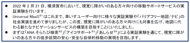 全日本空輸株式会社(本社:東京都港区、代表取締役社長:平子裕志、以下「ANA」)、横須賀市(市長:上地克明、以下「横須賀市」)、損害保険ジャパン株式会社(本社:東京都新宿区、代表取締役社長:西澤敬二、以下「損保ジャパン」)、株式会社プライムアシスタンス(本社:東京都中野区、代表取締役社長:大木雅人、以下「プライムアシスタンス」)、株式会社Ashirase(本社:東京都西東京市、代表取締役CEO:千野 歩、以下「Ashirase」)、ANAウィングフェローズ・ヴイ王子株式会社(本社:東京都大田区、代表取締役社長:汐見啓介、以下「AWO」)は、国土交通省の「令和3年度日本版MaaS推進・支援事業」の採択内容に基づき、2022年2月21日に、視覚に障がいのある方々向けの移動サポートの実証実験を横須賀市で行います。