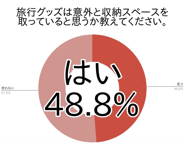 アンケートでは旅行グッズが意外と収納スペースを取っていると思うかと答えた方が約半数(関東48.8%・全国47.2%)でした。