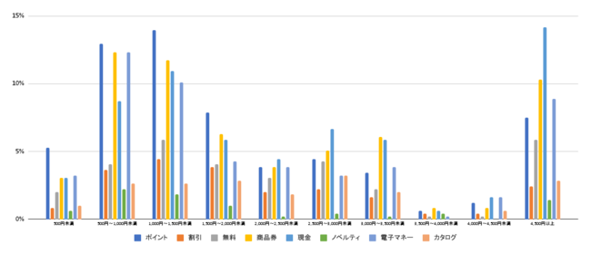 一方で、特典の相当金額のボリュームゾーンである500〜1,000円未満、1,000〜1,500円未満相当と回答した人の中では、「ポイント」や「電子マネー」が半数以上を占めました。少額であれば、日常の決済で使い勝手の良い電子マネーや貯めておくのに便利なポイントを選択する人が多いのかもしれません。