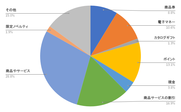 一方で、実際に受け取ってうれしかった特典として回答が多かったものは、「商品やサービス」(28.8%)、「商品やサービスの割引」(16.9%)でした。やはり自分が気に入って誰かに薦めた、もしくは興味があり誰かに薦めてもらった商品やサービスを無料で受け取れたり、割引価格で利用できたりすることは、キャンペーン参加者にとって魅力的な特典と感じられるようです。