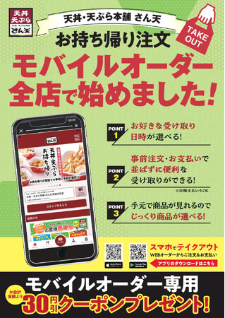 天丼・天ぷら本舗 さん天では、上記キャンペーンのほかにも日常的にお得に、便利に使っていただける「天丼・天ぷら本舗 さん天」公式アプリ、さらにモバイルオーダー機能として「『天丼・天ぷら本舗 さん天』お持ち帰り注文」がございます。ぜひご活用ください。