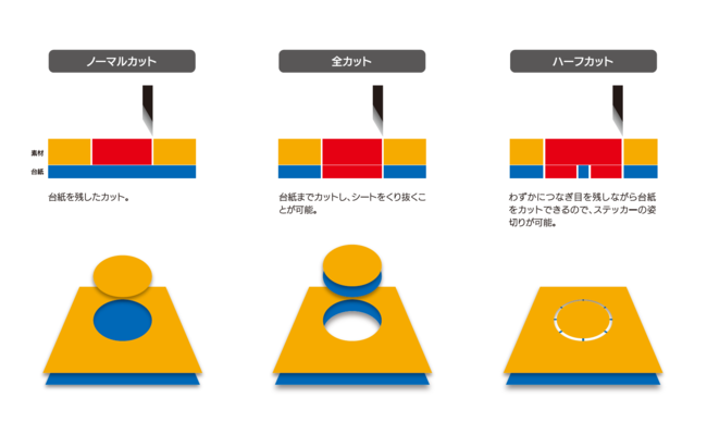 10gから550gまでカット圧が選択でき、ノーマルカット、全カット、ハーフカットといった3種類のカッティングが可能です。塩ビシート、蛍光・反射シート、ゴムシートなど、多様な素材のカッティングに対応しています。