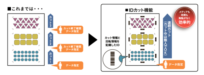 プリント時にRasterLink7によるデータ識別IDをプリントすることで、カット時にプリントしたIDから自動でカットデータを読み込んでカットを開始できる機能です。従来は、カットデータごとにトンボのスキャンとカットデータ指定をオペレーターが手作業で行っていましたが、「IDカット機能」を使うことで異なるデータでも無人連続カットが可能となります。マシンがカット作業を行っている間、オペレーターは別の作業を並行して進めることができます。