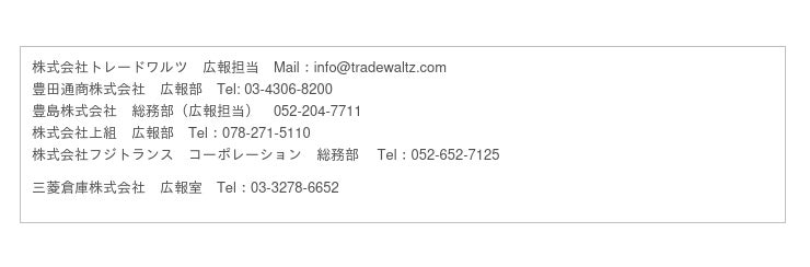 貿易情報連携プラットフォーム「TradeWaltz(R)」を運営する株式会社トレードワルツ(本社:東京都千代田区、代表取締役社長:小島 裕久、以下:トレードワルツ)は、豊田通商株式会社(以下、豊通)、豊島株式会社(以下、豊島)、株式会社上組(以下、上組)、株式会社フジトランス コーポレーション(以下、フジトランス)、三菱倉庫株式会社(以下、三菱倉庫)の5社から、9億円の追加資金調達を実施いたしました。これによりトレードワルツの資金調達累計は39億円となります。