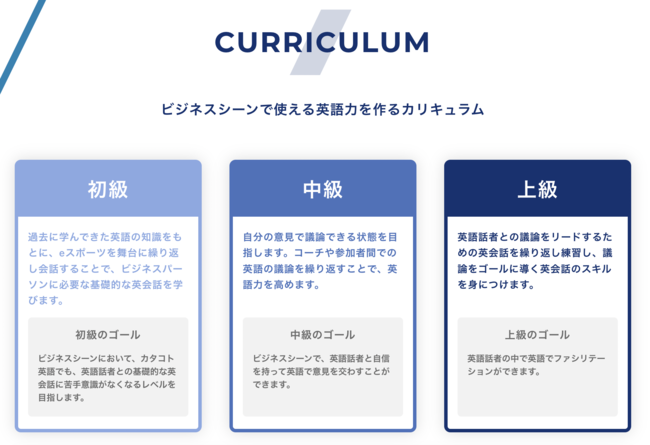 「リスキリングeスポーツ英会話(R)」では、レベルに応じた3つの難易度のレッスンを用意しております。