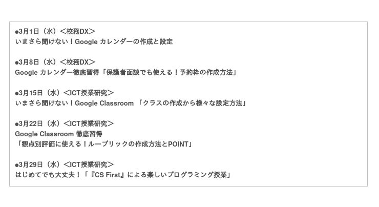 3月のセミナーでは、校務やICT授業に幅広く活用される「Google カレンダー™」と「Google Classroom」の具体的な操作方法・活用事例をお伝えします。