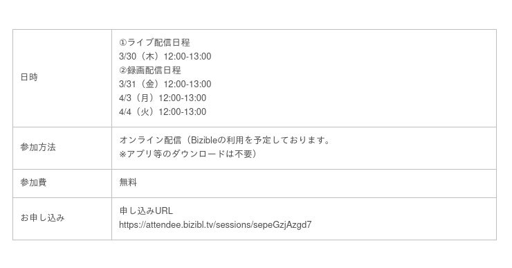 申し込みURL:https://attendee.bizibl.tv/sessions/sepeGzjAzgd7/form?session_id=seN74O7l17pE