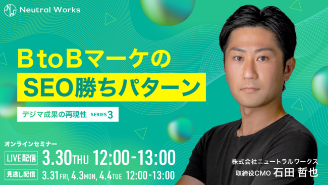 株式会社ニュートラルワークス(神奈川県茅ヶ崎市 代表取締役:三木五月、以下 ニュートラルワークス)は、オンライン無料ウェビナー「 BtoBマーケのSEO勝ちパターン【デジマ成果の再現性シリーズ3.】」を3月30日(木) 12時より実施いたします。