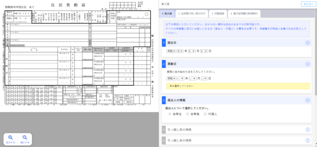 今回新たに導入されるサービスは、「転入」に関わる11手続きの申請書を、Webブラウザ上で作成するものです。