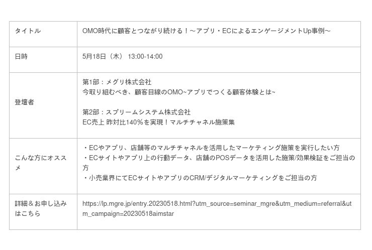 スプリームシステム株式会社(本社:東京都豊島区、代表取締役社長兼CEO:渡部 知博)は、2023年5月18日(木) 13時から、メグリ株式会社と共同で「OMO時代に顧客とつながり続ける!〜アプリ・ECによるエンゲージメントUp事例〜」と題した無料オンラインセミナーを開催いたします。