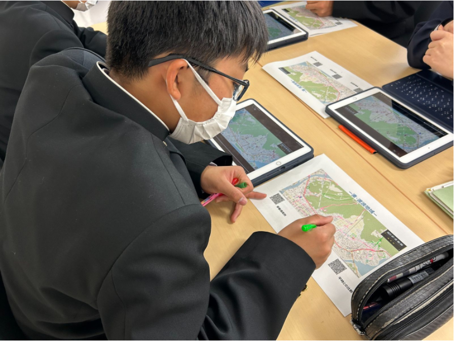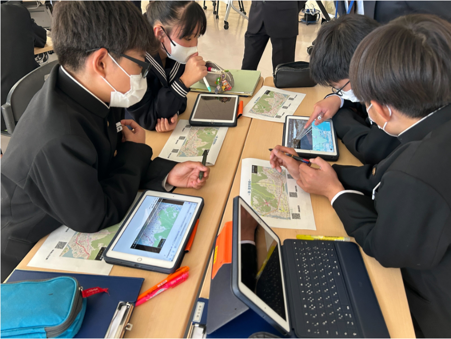 タブレット端末や地図を使い、真剣な表情で避難経路について考える生徒たち
