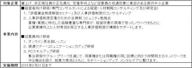 こうしたニーズに応えるため、本事業では、主に県内のサービス業や観光業を営む企業を対象として、企業の業績向上を図るとともに、従業員の処遇改善(賃金上昇、非正規社員の正社員化、定着率向上)の実現により、企業と従業員の双方が成長してゆくためのサポートを行ってまいります。