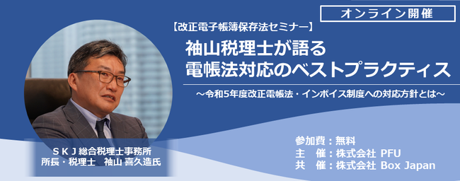 2023年4月19日(水曜日)に、国税庁OBで電帳法コンサルティングの第一人者である税理士 袖山 喜久造氏(SKJ総合税理士事務所)をお招きし、令和5年度に見込まれる改正内容を踏まえ、電帳法対応のベストプラクティスを解説いただくオンラインセミナーを開催します。(初回4月19日はLIVE配信、以降は、アーカイブ配信を予定)