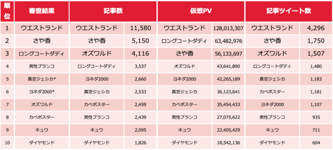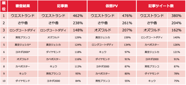 Qlipperのデータでは、記事数・仮想PV・記事ツイート数、そしてそれらの大会前からの増加率もすべてウエストランドが1位です。大会前後の1ヶ月ずつで比べると、記事数が約460%、仮想PVが約480%増えています。