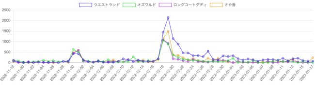 記事の数は全体的に増加傾向なことを考えると、M-1という大会の注目度は上がっています。しかし今大会出場者の大多数が、コンビそれぞれでは前大会出場者ほど大会後のニュース掲載を増やしていません。ここまではウエストランドとさや香に関心が集中しているとも言えます。
