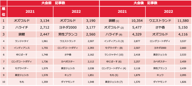 2021年大会後の調査結果では、審査順位が下位のモグライダーやランジャタイが記事などの数値と増加率で中位以上に来ていました。しかし、2022年大会でそうした現象は見られませんでした。