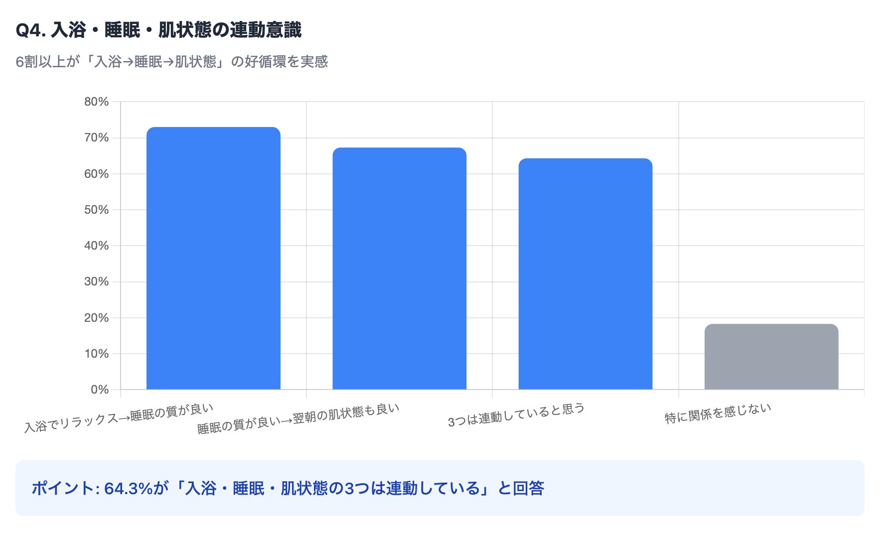 多くの人が、入浴→睡眠→肌状態という好循環の存在を実感していることが明らかになりました。
