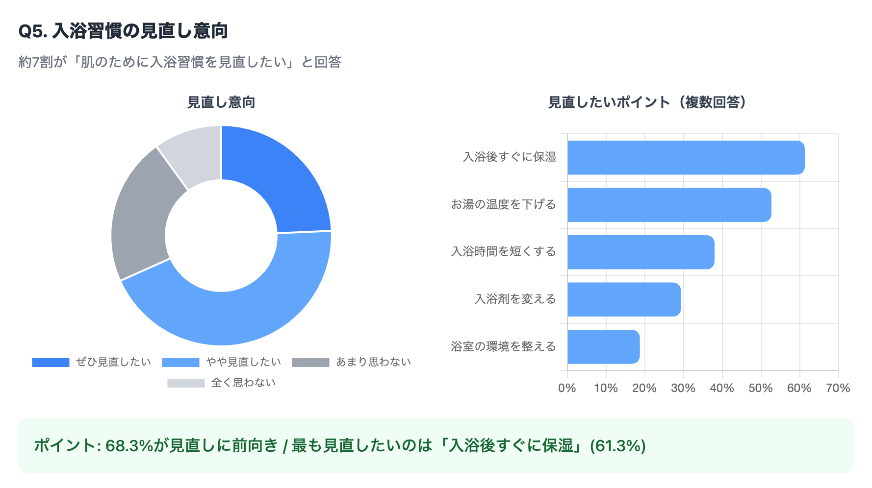具体的に見直したいポイントとしては(複数回答可)、「お湯の温度を下げる」(52.7%)、「入浴後すぐに保湿する」(61.3%)、「入浴時間を短くする」(38.0%)、「入浴剤を変える」(29.3%)が上位に挙がりました。