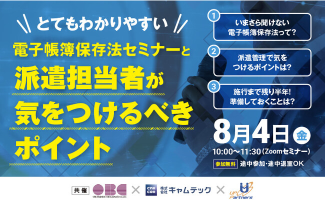 「働く」に関する社会課題をビジネスで解決するキャムコムグループの株式会社キャムテック(本社:東京都港区浜松町、代表取締役:西野弘一 縄田崇、以下キャムテック)は、2023年8月4日に派遣先企業様向けWEBセミナー『OBC・アップパートナーズ共催 とてもわかりやすい電子帳簿保存法セミナーと派遣担当者が気をつけるべきポイント』を開催いたします。