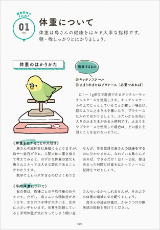 体重について、飲水量について、ごはんについて、便について、換羽について、産卵について、発情について、運動について、食事制限のコツ、毎日の健康チェックポイント、季節ごとのお世話