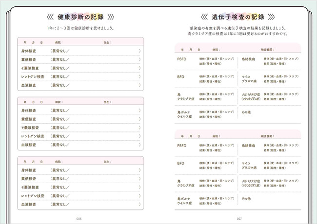 健康診断の記録や、遺伝子検査の記録ページもついています。1冊にまとめて振り返りやすく。毎日の健康記録とあわせて、鳥さんの健康管理にご活用ください。