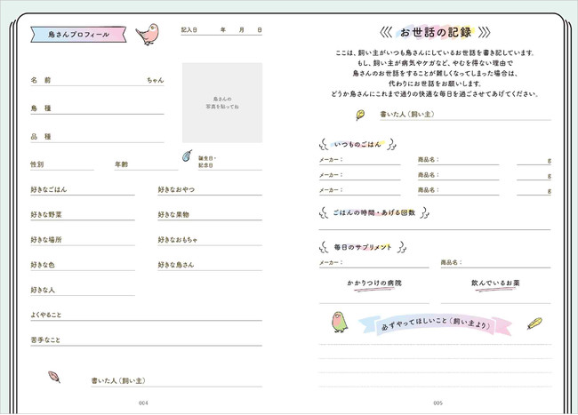 鳥さんプロフィールの隣には、いつものお世話を書き記す「お世話の記録」ページがあります。もし、飼い主さんが病気やケガなど、やむを得ない理由でお世話が難しくなってしまった場合でも、ノートといっしょに代わりのお世話を託せるように。このページがあれば安心です。