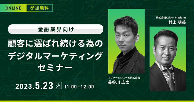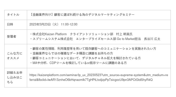 スプリームシステム株式会社(本社:東京都豊島区、代表取締役社長兼CEO:渡部 知博)は、2023年5月23日(火) 11時から、株式会社Kaizen Platformと共同で「【金融業界向け】顧客に選ばれ続ける為のデジタルマーケティングセミナー」と題した無料オンラインセミナーを開催いたします。