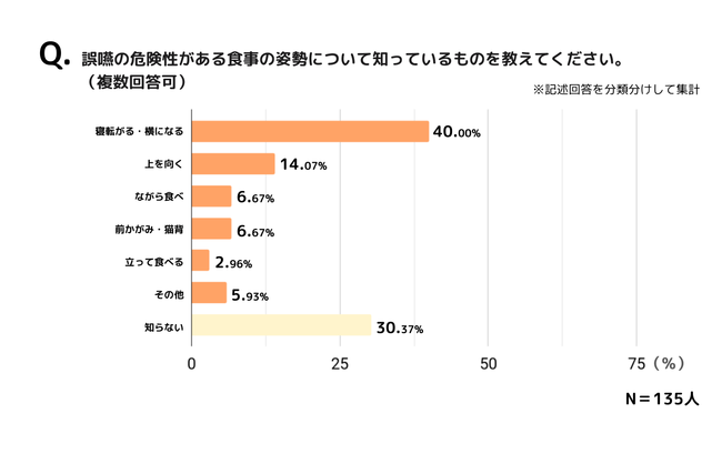 誤嚥の危険性がある食品を知っているかという質問に対しては、「豆・ナッツ類(48.89%)」「餅(34.81%)」「飴(28.89%)」という結果で、88.89%が一つ以上の食材をあげました。誤嚥の危険性がある食事の姿勢について知っているかと聞いたところ、「寝転がる・横になる(40.00%)」「上を向く(14.07%)」「ながら食べ(6.67%)」という結果で、69.63%が一種類以上の姿勢をあげています。