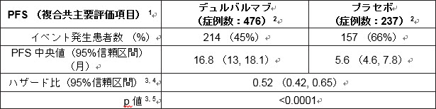 2. ITT患者集団 (治療から脱落した患者さんも含めた集団) のうち, デュルバルマブ群の7%およびプラセボ群の10%の患者さんがRECIST v1.1に準拠したBICRにより判定された測定不能病変を有していました。