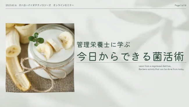 日本カバヤ・オハヨーホールディングスグループにおいて、ヘルスケア領域で事業を展開しているオハヨーバイオテクノロジーズ株式会社(本社:東京都千代田区、代表取締役社長:野津 基弘)は、オンラインセミナー『管理栄養士さんに聞こう!簡単にできる菌活のやり方について編』を5月16日(火)に開催いたしました。
