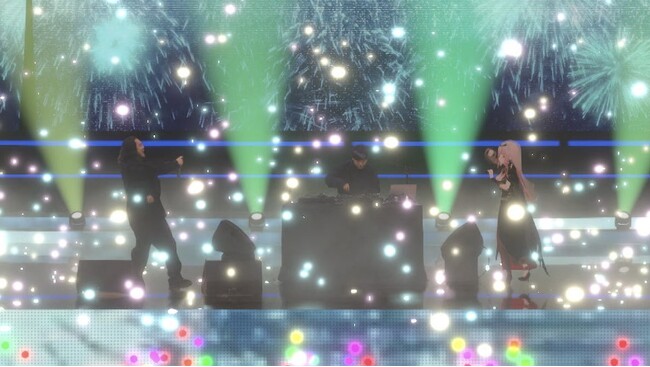 これら先進の映像技術を組み合わせることにより、今回のイベントにおいて、リアルとバーチャルを融合した新たな映像体験サービスを提供しました。具体的には、キヤノンが実在のアーティストをボリュメトリックビデオシステムでリアルタイムに撮影・3Dデータ生成を行うと同時に、バルスもモーションキャプチャによってVTuberと呼ばれるバーチャルアーティストを生成します。それぞれの3Dデータをバルスのバーチャルライブシステムに取り込み、瞬時に結合することで、リアルとバーチャルのアーティストを同じCG空間上に時差なく登場させることが可能です。これにより、CGならではの自由なカメラワークと空間演出を生かしながら、アーティスト同士が次元を超えて息の合ったパフォーマンスを繰り広げる、没入感の高い音楽ライブの配信を実現しました。