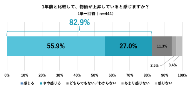 0歳・1歳の子どもがいる女性444人に、1年前と比較して、物価の上昇を感じるかと質問したところ、55.9%が「感じる」、27%が「やや感じる」と回答。合わせて82.9%が物価の上昇を実感していることがわかりました。