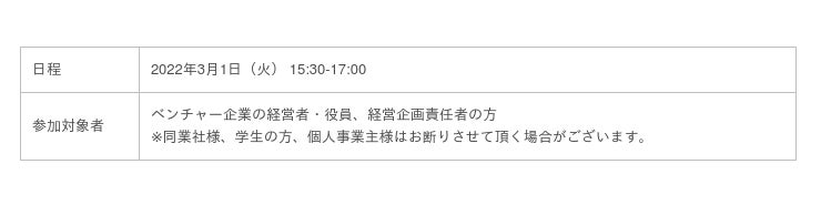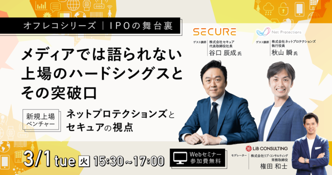 本セミナーではオフレコセッションとして、上場直後のお二人からIPOまでの舞台裏について生々しく語っていただきます。上場準備を具体的に進めている会社様にとっても、アーリーステージのスタートアップ企業様にとっても、一連の上場プロセスを模擬体験できる有意義な時間になると思いますので、ご参加をお待ちしております。なお、本セミナーは100名限定のオフレコ企画となっておりますので、ご希望の方はお早めにお申し込みください。