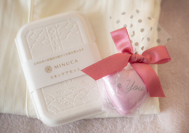 ご滞在者へのスペシャルプレゼントとして、癒しのバスタイムをお楽しみいただけるフランフラン入浴剤、お米由来の保湿成分で美肌ケアが叶うMINUCAスキンケアセット、くつろぎの時間を演出する花茶やお灸などをご用意しています。