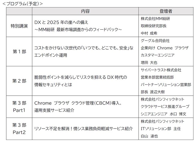 株式会社パシフィックネット(本社:東京都港区、代表取締役社長:上田 雄太、以下 当社)は、2023 年11 月28 日(火)に、サイバートラスト株式会社との共催、株式会社MM 総研、およびグーグル合同会社の協力のもと、『迫りくる「2025 年の崖」に備え情シス部門は、いま何をすべきか!?』セミナーを開催いたします。