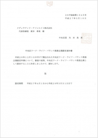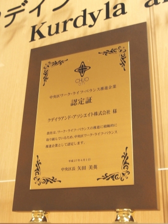 クデイラアンド・アソシエイト 「東京都中央区ワーク・ライフ・バランス推進企業」に認定される