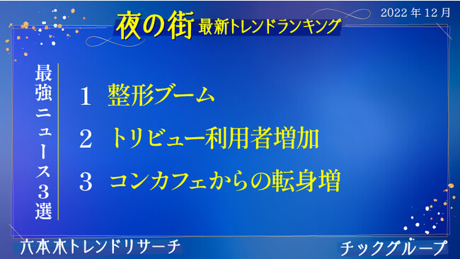今六本木では整形関連が特に話題!特に「トリビュー」という美容医療の口コミ・予約アプリが人気で、二重、涙袋、ヒアルロン酸注入などが注目にあがっています。コンカフェからの転身については、以前ガールズバーからの転身が多かった中で、今年の特徴としてあげられています。