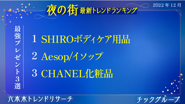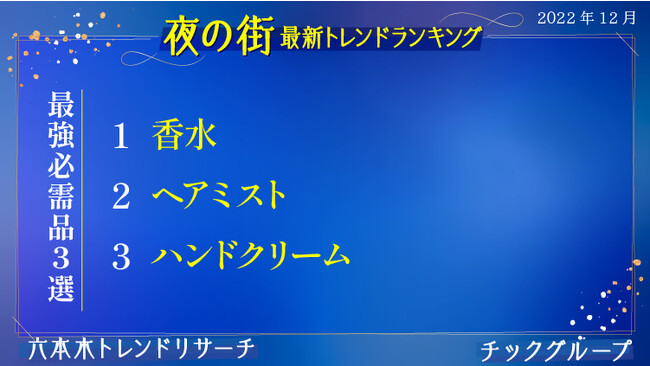 30年の歴史を持ち、流行発信地渋谷からティーンを中心としたトレンドを発信し続ける「渋谷トレンドリサーチ」と、創業27年、六本木/銀座エリアを中心に富裕層向け高級クラブとして4店舗を構える「クラブチックグループ」が、チックグループ勤務キャストを対象にトレンド調査を実施。女性たちの生の声を反映した『六本木トレンドリサーチ』を配信します。