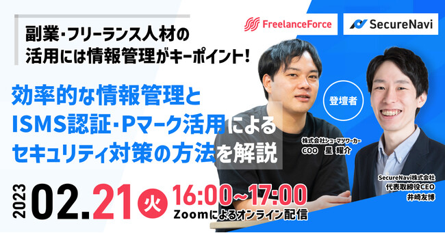 【2/21開催】副業・フリーランス人材の活用には情報管理がキーポイント!フリーランスフォース×SecureNaviが、効率的な情報管理とISMS認証・Pマーク活用によるセキュリティ対策の方法を完全解説